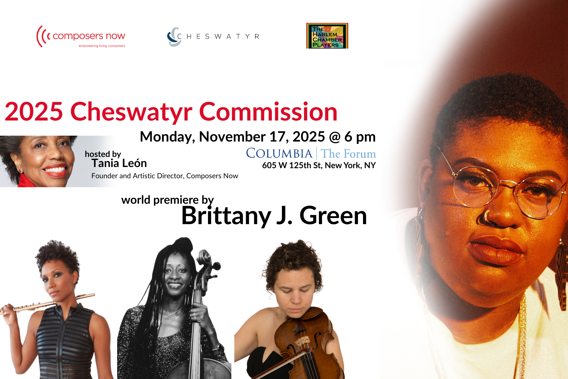 Composers Now presents members of The Harlem Chamber Players in a concert featuring music by living women composers, including a world premiere by Brittany J. Green. This concert is sponsored by the Cheswatyr Foundation.